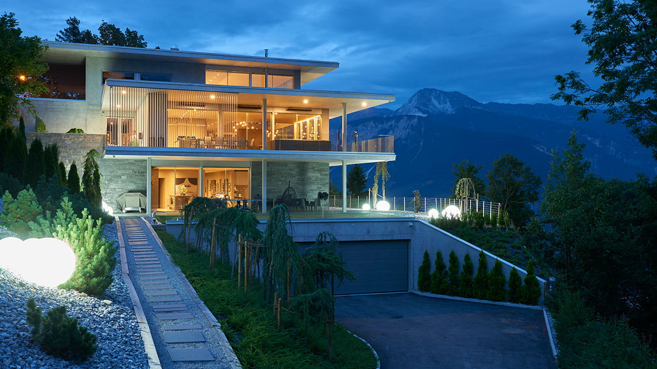 Mit seinen kubischen Formen hebt sich dieses Haus von den Villen anderer Stilrichtungen im Süden Münchens ab. Der Neubau aus grauem Naturstein ist in einen Steilhang gebettet und staffelt sich z-förmig den Hang hinauf. Treppen überbrücken die zwei Ebenen zwischen Erschließungsebene auf Straßenniveau und Wohnebene. Der Wohnbereich verfügt über große Glasflächen mit Blick auf Terrasse und Garten. Bei der Lichtführung setzt der Architekt auf hochisolierte Fenster-und Schiebesysteme von Sky-Frame, die mit insulbar® Wärmedämmprofilen ausgestattet wurden.