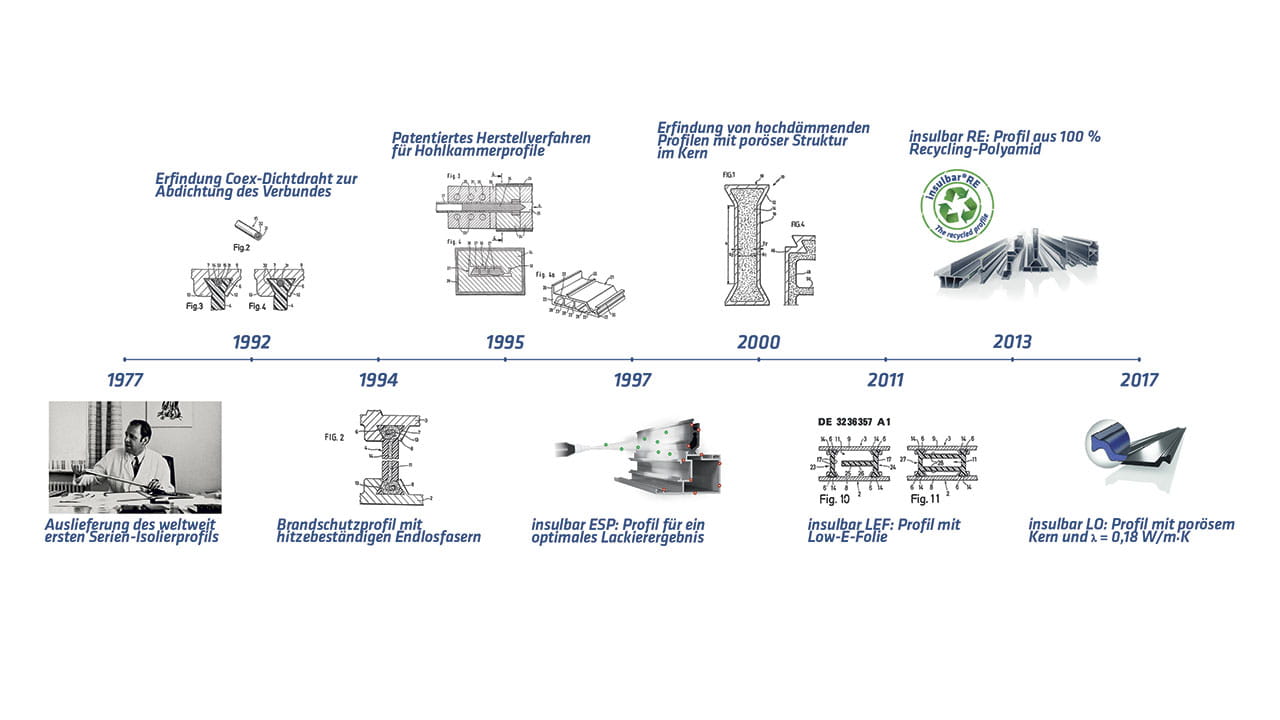 Hitos del desarrollo de los perfiles termoaislantes insulbar para marcos de metal de ventanas, puertas y fachadas.