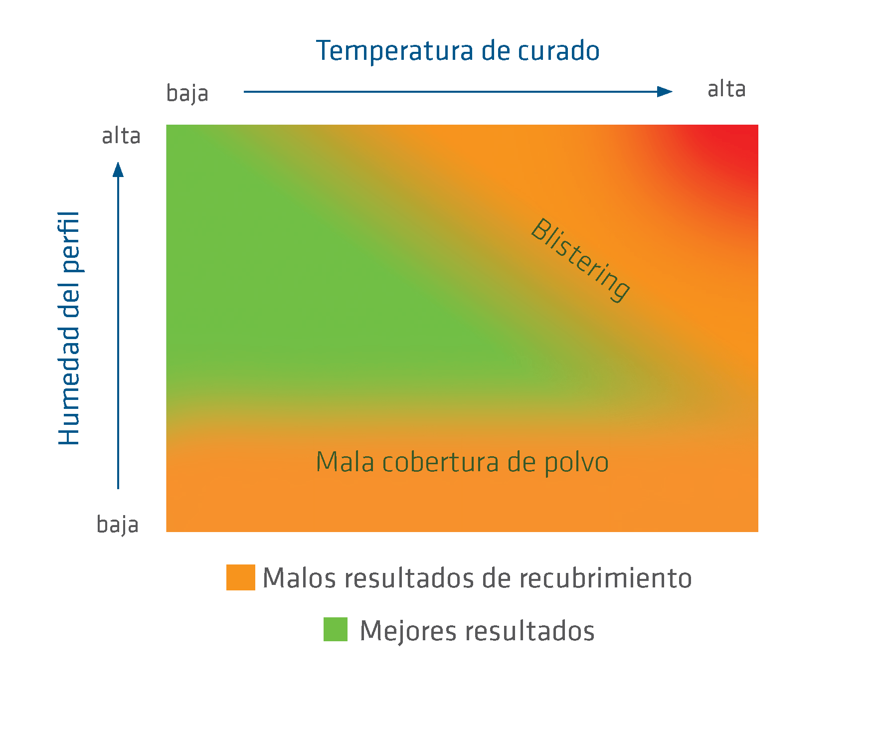 La superficie se hace eléctricamente conductora mediante un proceso patentado. Las partículas de polvo electrostáticamente cargadas son atraídas a la superficie puesta a tierra del perfil aislante de manera similar a la atracción de los metales conductores. Esto significa que tanto los perfiles ensamblados de aluminio-plástico como los perfiles de PA solitarios pueden ser recubiertos de manera óptima, resultando en una apariencia sobresaliente en ambos casos.