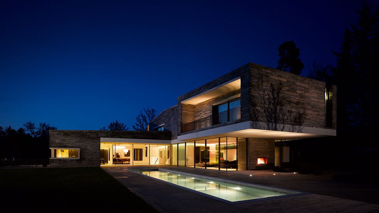 Con sus formas cúbicas, esta casa se diferencia de las villas de otros estilos al sur de Múnich. El edificio de nueva construcción de piedra natural gris está ubicado en una pendiente, por la cual asciende gradualmente en forma de z. Escaleras salvan los dos niveles entre la entrada, al nivel de calle y el planta residencial. La zona residencial dispone de grandes cristaleras con vistas a la terraza y al jardín. Para guiar la luz, el arquitecto apuesta por sistemas de ventanas y correderas altamente aislantes de Sky-Frame, los cuales fueron equipados con perfiles termoaislantes insulbar®.