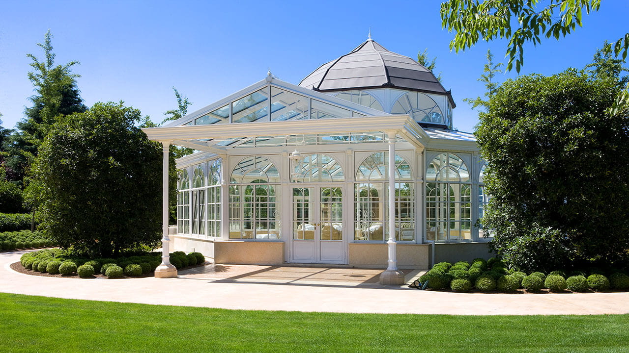La gran cantidad de superficies acristaladas confieren un aspecto moderno a esta clásica orangerie. Los perfiles termoaislantes insulbar® procuran un clima ambiente agradable y hacen posible la utilización del espacio durante todo el año.