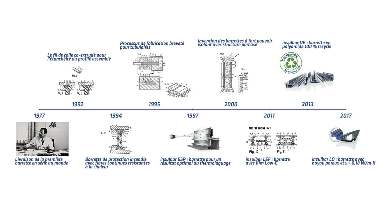 Jalons du développement des barrettes d’isolation thermique insulbar pour les châssis métalliques de fenêtres, portes et façades.