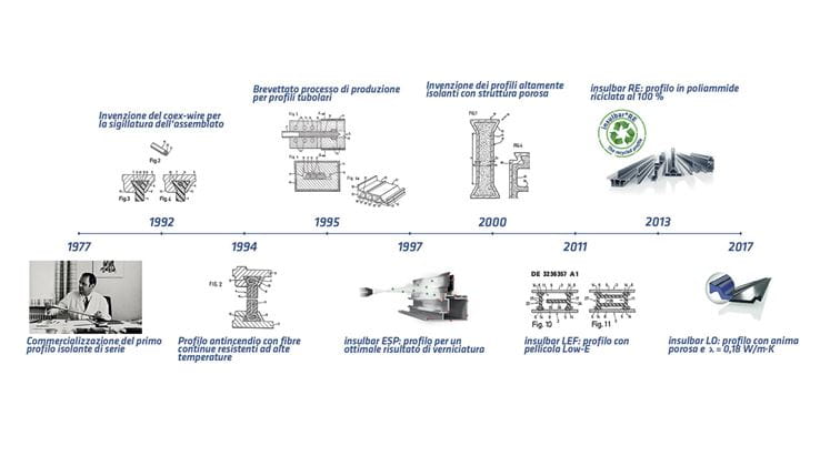 Pietre miliari dello sviluppo dei profili termoisolanti insulbar per intelaiature metalliche di finestre, porte e facciate.