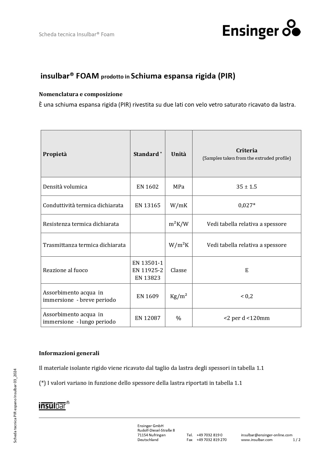Si tratta di un inserto in poliisocianurato rigido espanso (PIR), rivestito su entrambe le facce con velo vetro saturato e incollato sui profili insulbar con una colla a base acqua non infiammabile.