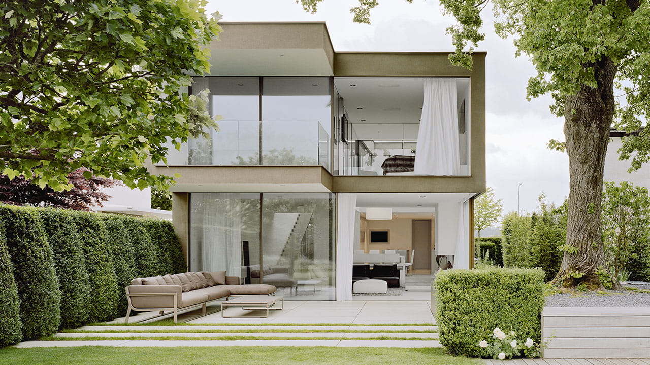 Esta casa destaca-se das mansões estilisticamente divergentes no sul de Munique com as suas formas cúbicas. A nova construção em pedra natural cinzenta está inserida numa escarpa e disposta na encosta em forma de Z. As escadas estabelecem a ligação entre o nível de acesso no patamar da estrada e o nível residencial. A área residencial apresenta grandes superfícies de vidro com vista sobre o terraço e o jardim. No que respeita à orientação da luz, o arquiteto obtou por um sistemas de janelas e de correr altamente isolados da Sky-Frame que vêm munidos de perfis de isolamento térmico insulbar®.