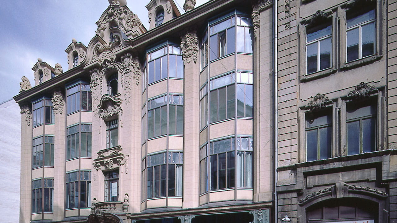 Uma reconstrução fiel ao original da histórica fachada de sacada por Josef Gartner no Steibs Hof, em Leipzig. insulbar® isola perfis de cobre e alumínio numa unidade de suporte estática.