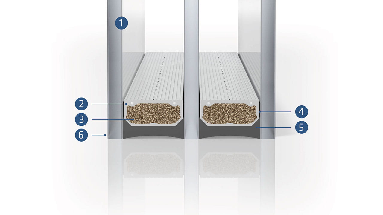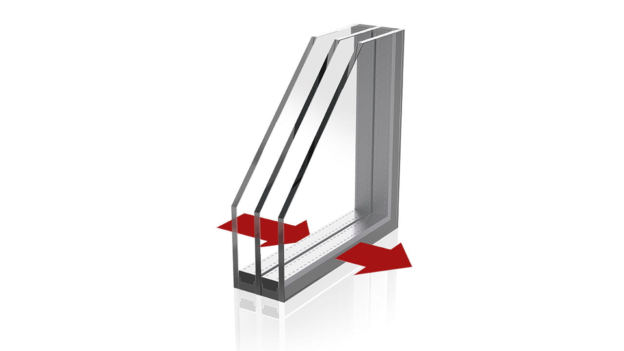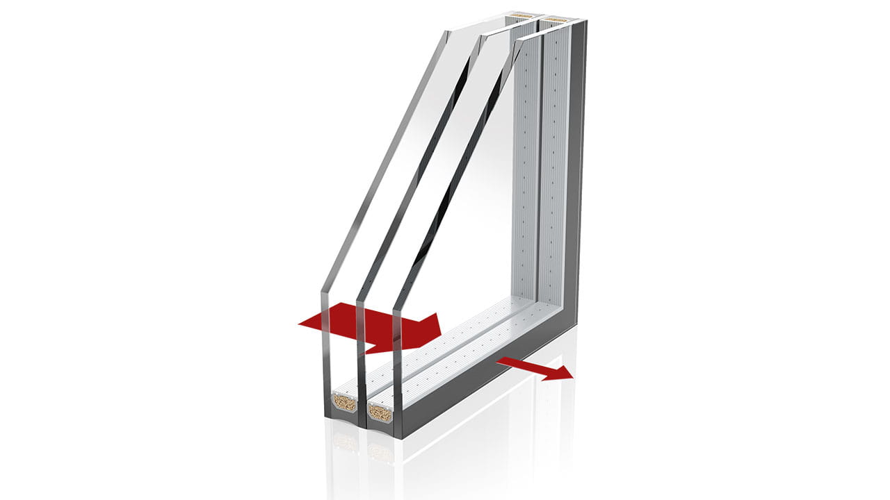中空玻璃由两层或三层玻璃片组成。根据所需的功能,玻璃片上带有不同的涂层。例如:内片玻璃额外配有 Low-E 隔热涂层。玻璃夹层空间内填充有惰性气体,从而在根本上改善隔热效果。为了保证中空玻璃长期使用的有效性,必须对其边缘部位进行严格地密封来封住玻璃面板之间的空间。既防止湿气的侵入,又避免气体的逸出。然而在其边缘部位处,热量是可以自由地流动的。因此,必须通过所谓的间隔条来实现玻璃片的隔热。正如其名字所体现的一样,这种间隔条使多层中空玻璃的玻璃片之间保持一定间距。这就阻断了与靠近窗框侧玻璃片之间的热传导,从而降低热传导率。分别根据不同的中空玻璃结构,间隔条通过紧贴两层或三层玻璃片的外侧边缘来组成一个中空玻璃单元,而这种间隔条的导热性能对于玻璃与窗框之间的线传热系数有着决定性的影响。间隔条的功能在于持久地保证每层玻璃片之间保持预先设定的玻璃夹层空间,并且沿间隔条周长打上由丁基胶制成的一道胶及二道胶,其能够可靠地将玻璃夹层空间与外界隔离。同时,在玻璃的整个使用寿命周期内,作用于中空玻璃的气候荷载将影响到其边缘部位。因此间隔条必须持久地承受这些负荷。