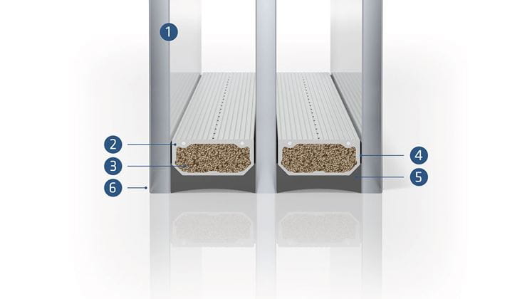 图片文字说明:间隔条 — 出自德国恩欣格(Ensinger)公司的添益隔 — 使多层中空玻璃的三片玻璃之间保持一定间隔。(1)带涂层的浮法玻璃(2)间隔条(例如添益隔)(3)分子筛(4)一道胶(5)二道胶(6)中空玻璃边缘组合。